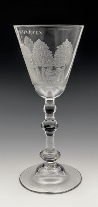 Kelkglas gegraveerd met buitenhuis en "T PLESIERIG B...