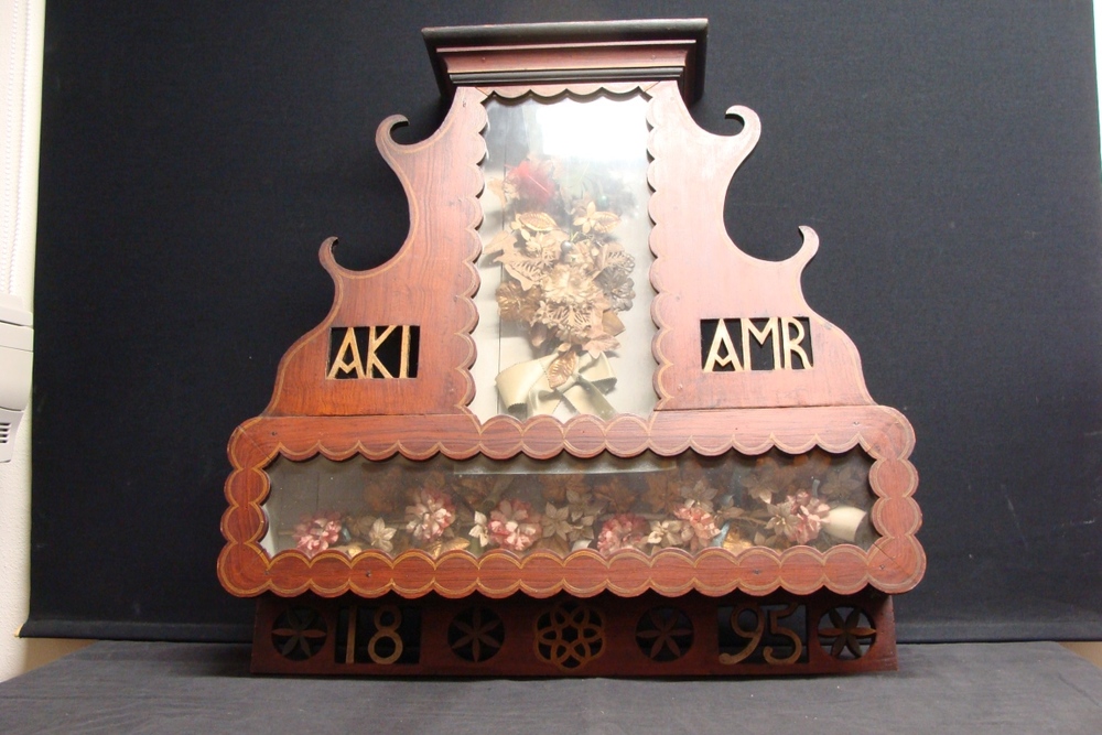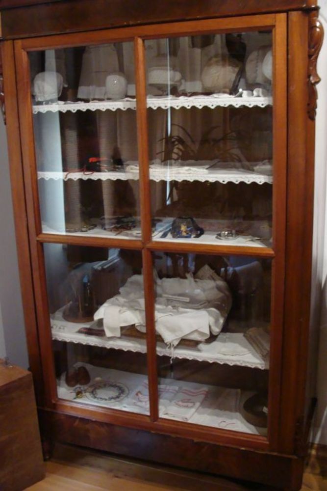 Vitrinekast met o.a. doopmutsen