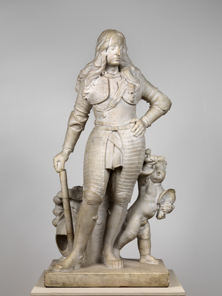 Prins Maurits in harnas, zittend op een taboeret