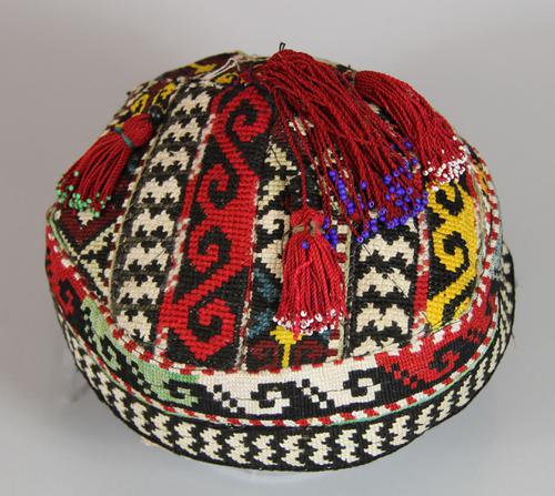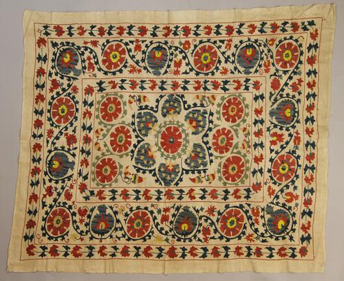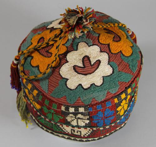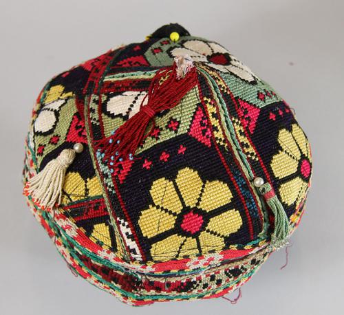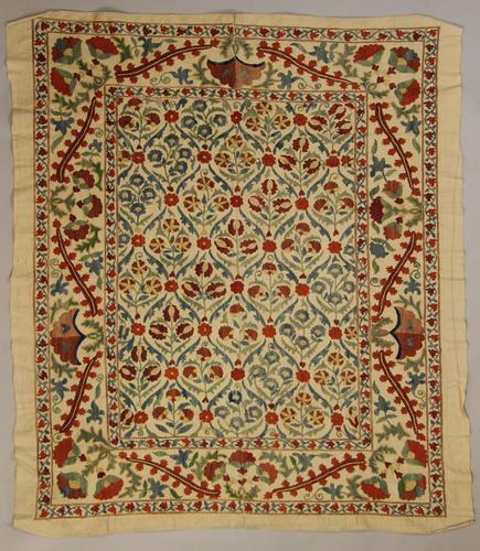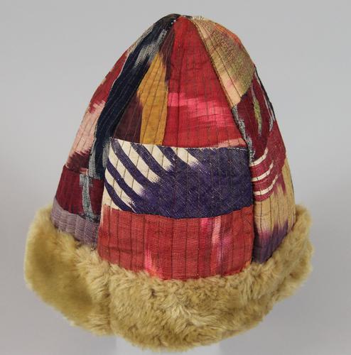 : Silk (ground and lining) with several types of metal thread; metal thread lace and plaited band and sequins; linen (interlining) (1)