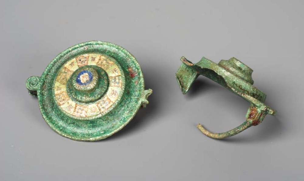 Geëmailleerde schijffibula van brons uit de Romeinse...