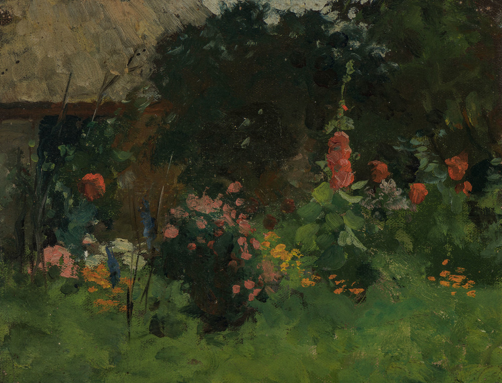 Eperhuisje met stokrozen