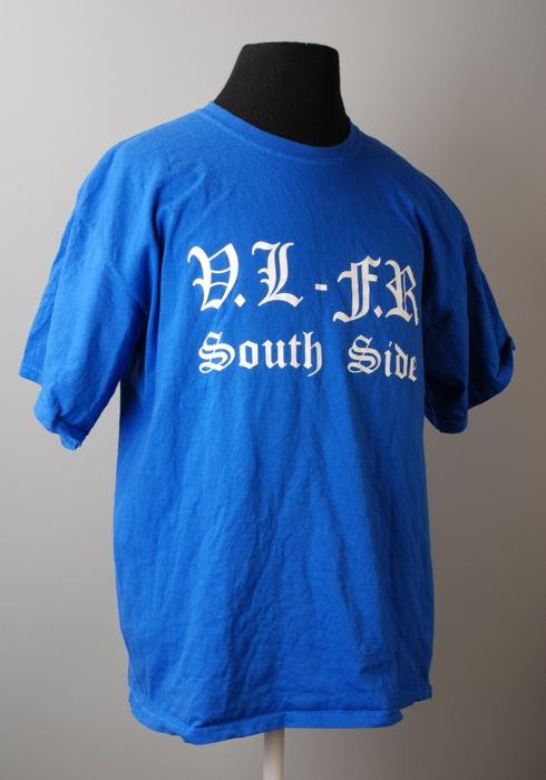 Blauw t-shirt met opdruk in witte Gotische letters "...