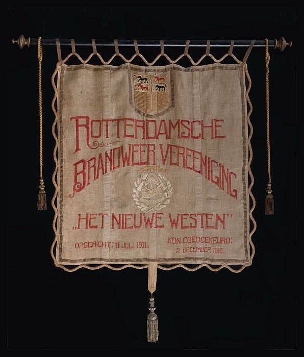 Wit linnen vaandel geborduurd met tekst, brandweer, ...