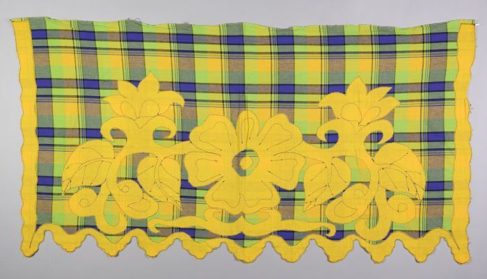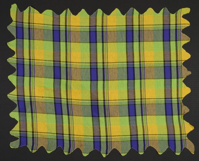 Hoofddoek van paars, groen en geel geruite stof