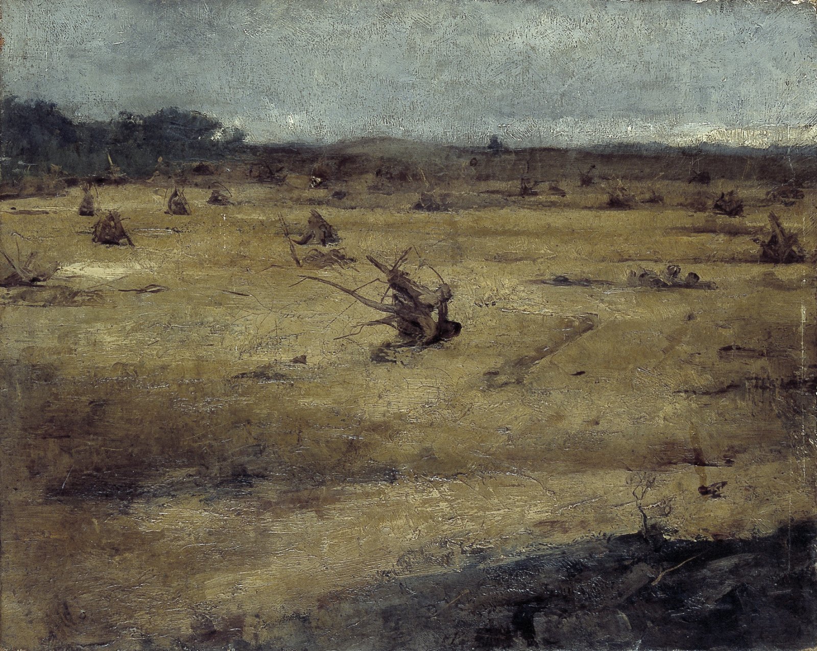 Heidelandschap met boomstronken