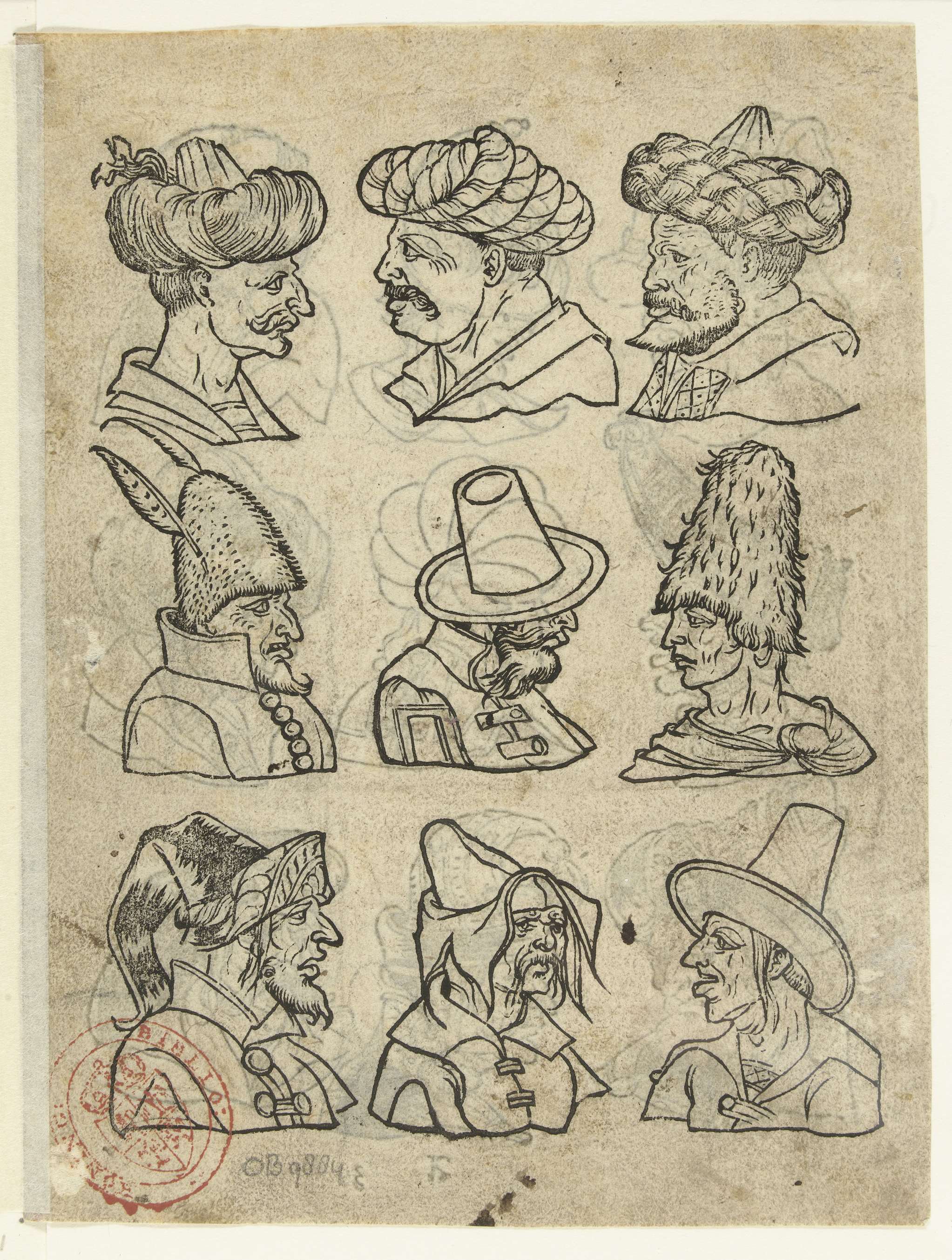 Negen mannenhoofden met verschillende soorten hoofdb...