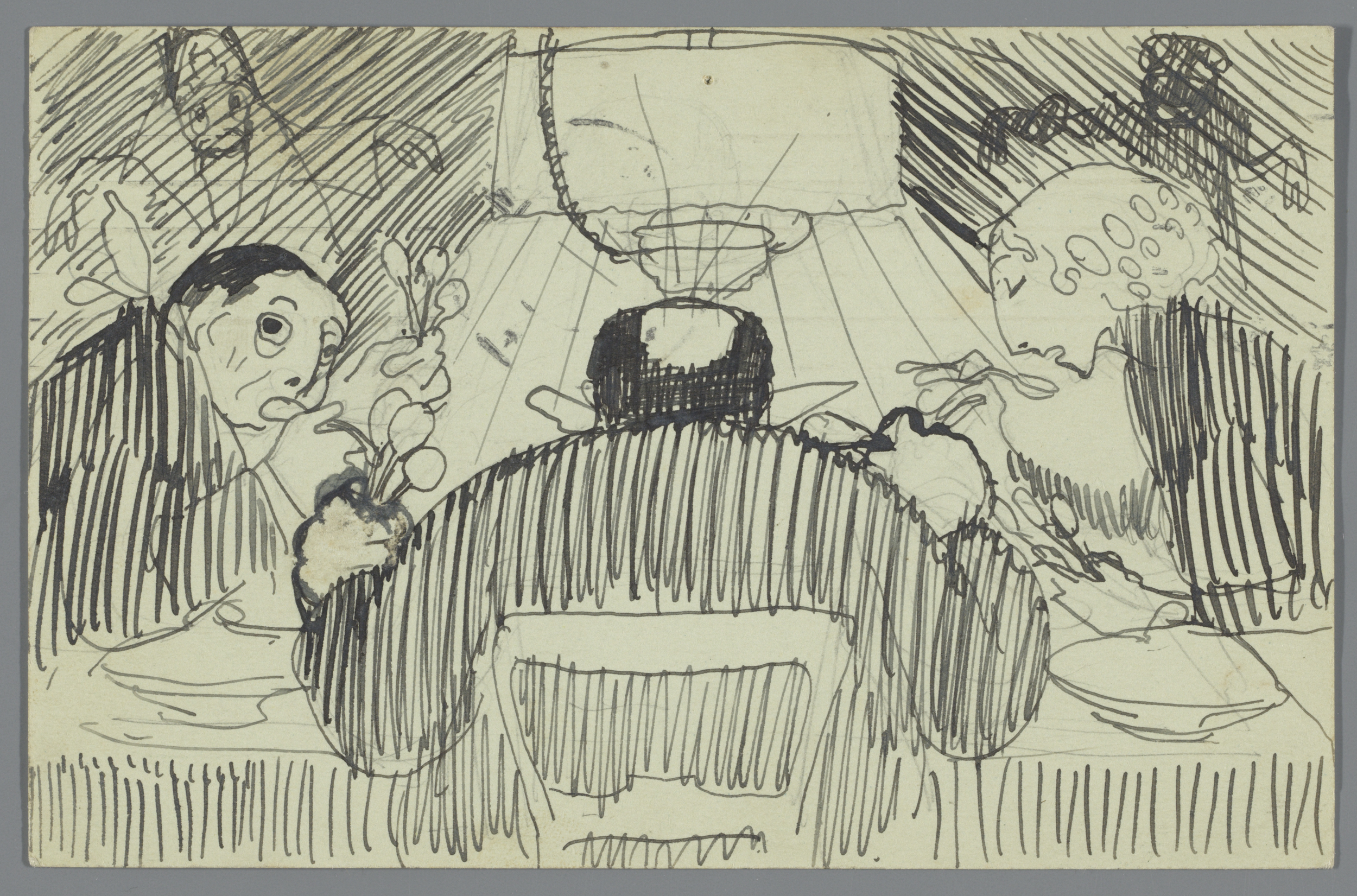 Kindertekening van lopende figuren en een huis