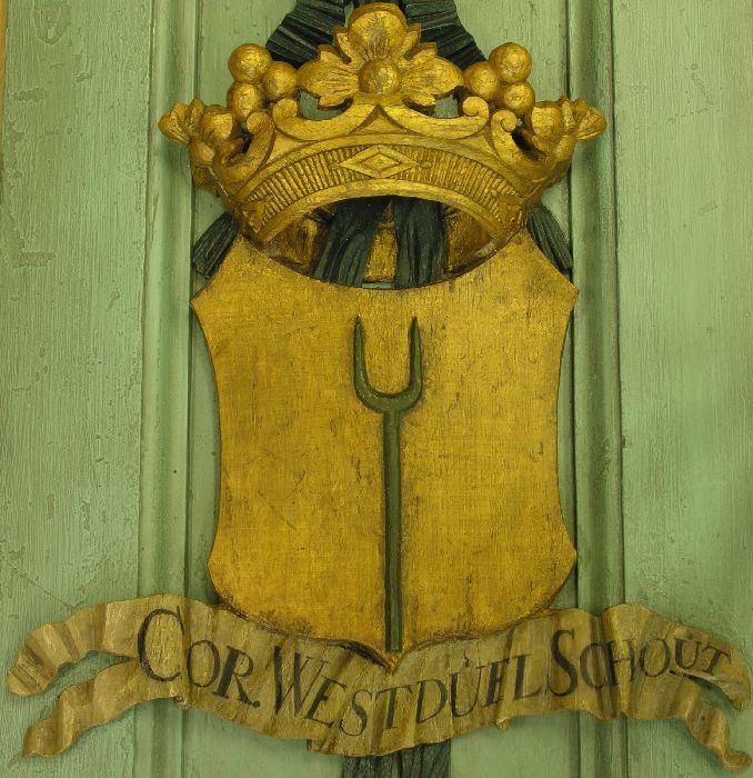 Gekroond familiewapen uit eikenhout gesneden, gouden...