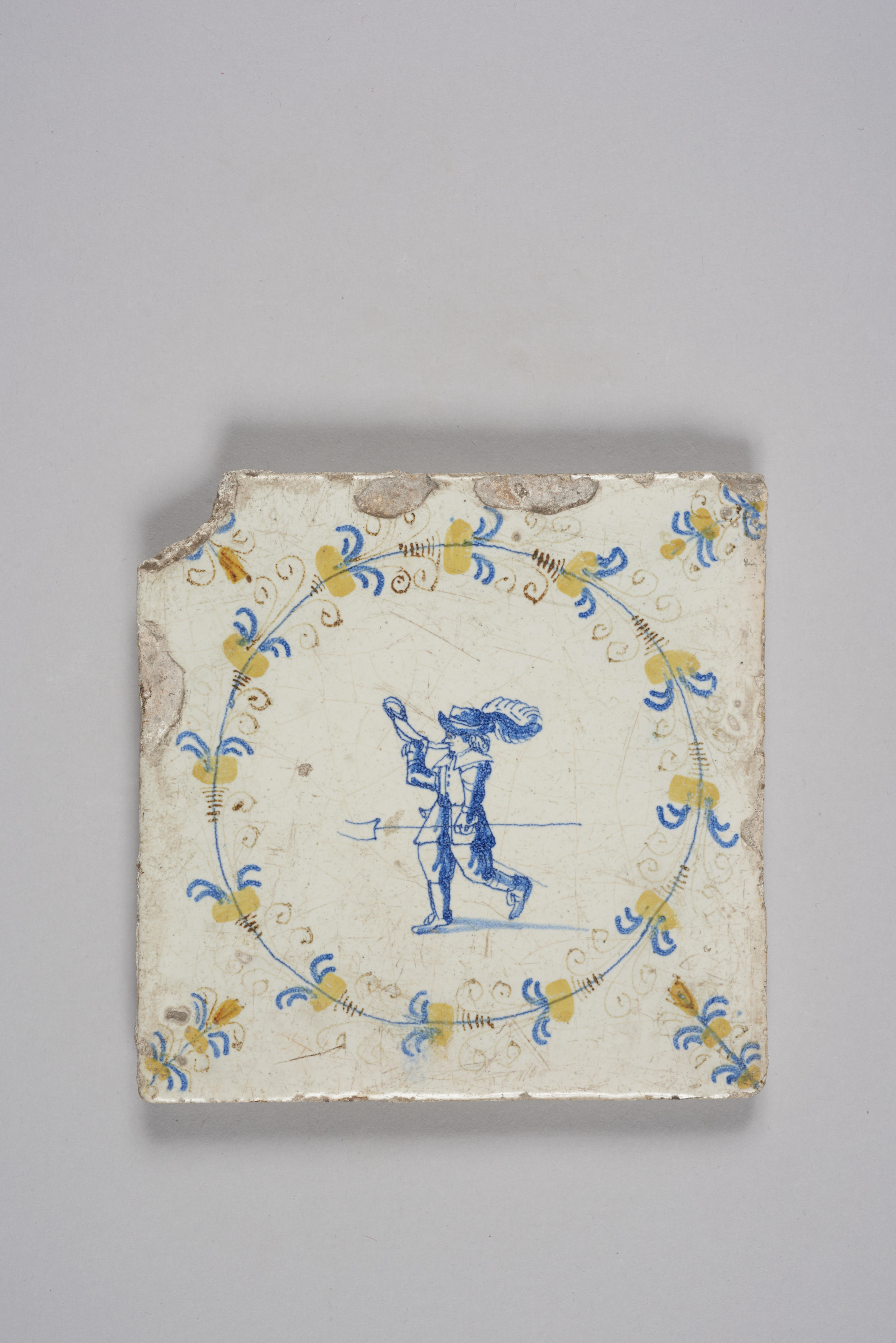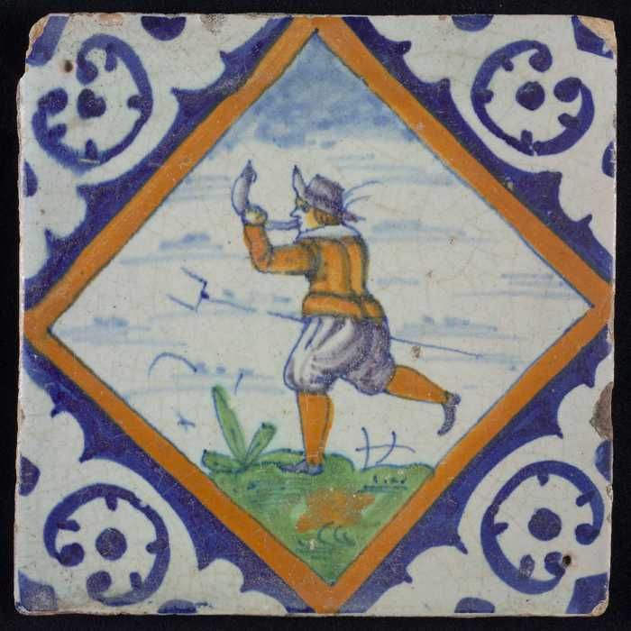 Wandtegel met afbeelding man, blazend op een hoorn, ...