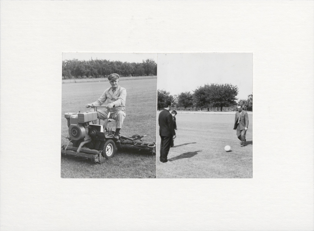 1. Man op maaimachine sportveld; 2. voetballende mannen