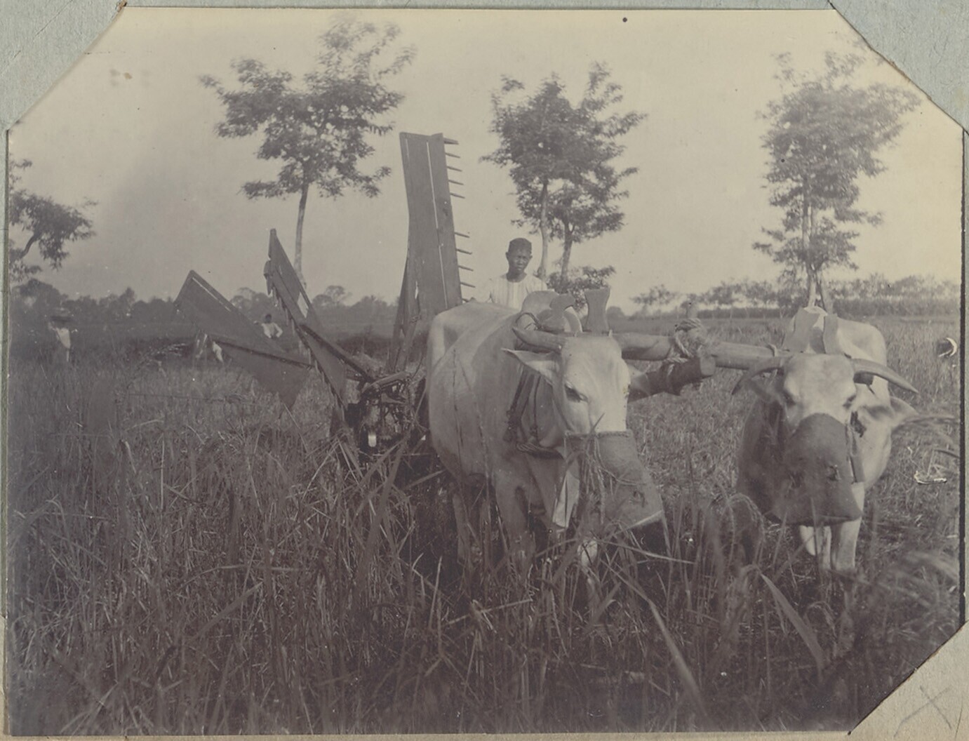 Oogsten met de maaimachine voortgetrokken door karbo...